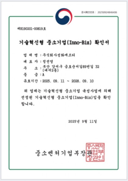 • 기술혁신형 중소기업 (Inno-Biz) 확인서