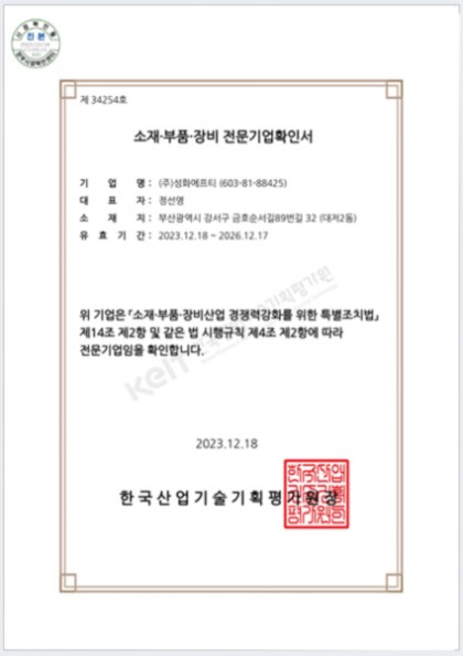 • 소재·부품·장비 전문기업확인서 성화에프티