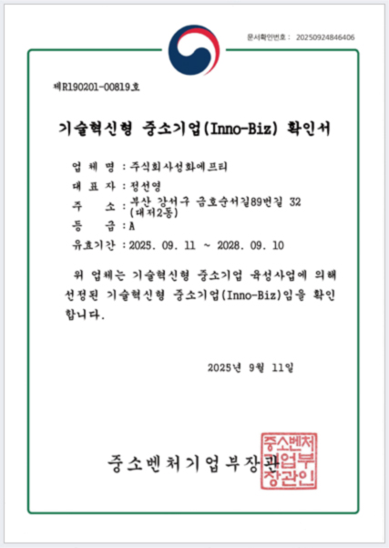 기술혁신형 중소기업 (Inno-Biz) 확인서 페이지 정보 작성자 성화에프티 작성일25-09-09 15:55 조회28회 댓글0건 관련링크 이전글 목록 본문 기술혁신형 중소기업 (Inno-Biz) 확인서 이전글 목록