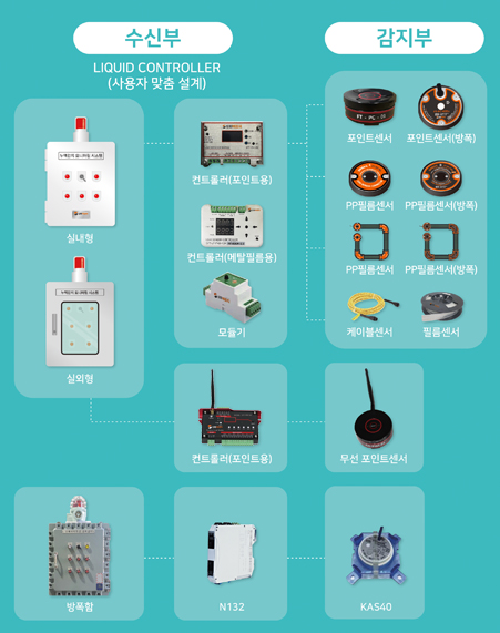 본 제품은 물과 액상 화학물질을 구별하여 화학물질에만 감지하는 특수 포인트 센서로 세계 최초의 기술로 개발 다양한 설치 환경에 최적화 되어 실내 · 외 구분 없이 사용 가능 단순히 컨트롤러의 신호선을 연장하는 기능을 제공하는 것이므로 유지보수가 거의 불필요함 범용성 극대화한 제품으로 용액을 저장하는 건물, 탱크 주변, 물질 이송 배관 부분 등 용액이 누출될 수 있는 다양한 장소에 설치 가능