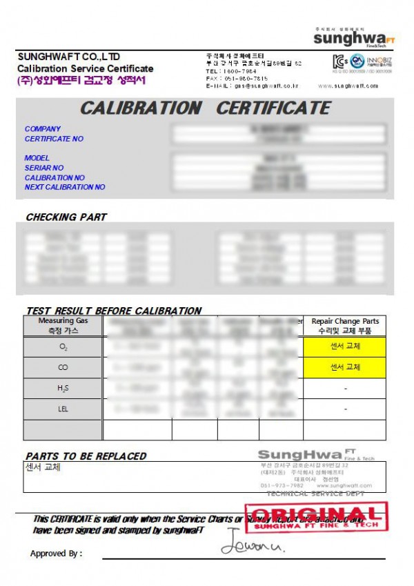 검교정 결과 O2, CO센서 에러로 센서 교체및 검교정을 진행 했습니다